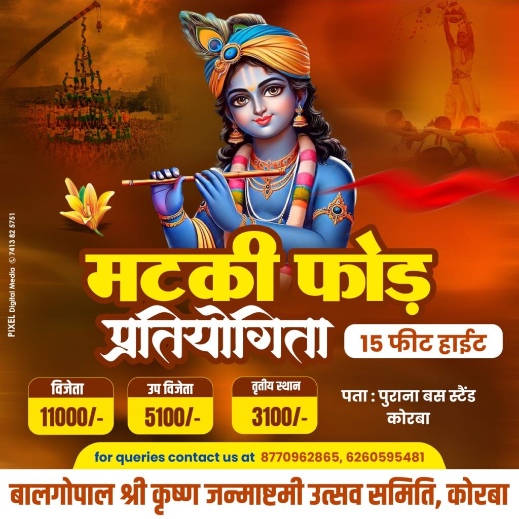 श्री कृष्ण जन्माष्टमी के अवसर पर बालगोपाल श्री कृष्ण जन्माष्टमी उत्सव समिति, कोरबा द्वारा आगामी 16 अगस्त को पुराना बस स्टैंड में पहली बार भव्य मटका फोड़ प्रतियोगिता का आयोजन किया जाएगा। यह कार्यक्रम शाम 6 बजे से शुरू होगा, जिसमें 15 फीट ऊँचाई पर लटकी मटकी को फोड़ने के लिए टीमें अपनी ताकत और रणनीति का प्रदर्शन करेंगी।