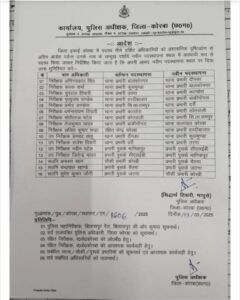 News कोरबा पुलिस अधीक्षक सिद्धार्थ तिवारी ने विभाग में कसावट लाने के उद्देश्य से विभाग में बड़ा फेरबदल किया है। Shivansh khatri March 19, 2025 1 min read कोरबा(छत्तीसगढ़ टाइम्स 24×7)कोरबा पुलिस अधीक्षक सिद्धार्थ तिवारी ने विभाग में कसावट लाने के उद्देश्य से विभाग में बड़ा फेरबदल किया है। लगभग सभी थानो के साथ पुलिस सहायता केंद्रों के प्रभारी बदले गए हैं। देखिए सूची Shivansh khatriCheaf Editor of Chhattisgarhtimes 24×7Continue ReadingPrevious: गरियाबंद : भीषण गर्मी में लू से बचाव एवं उसके उपाय हेतु आवश्यक सुझावNext: नूतन सिंह के पक्ष में एकजुट हुआ छत्तीसगढ़िया सर्व समाज सभापति का सम्मान किया, बोले हम साथ हैं Related Stories बोर्ड परीक्षा व होली को लेकर सख्त निर्देश: कोरबा पुलिस ने डीजे संचालकों व होली सामग्री विक्रेताओं की अलग-अलग बैठक ली 1 min read News कोरबा बोर्ड परीक्षा व होली को लेकर सख्त निर्देश: कोरबा पुलिस ने डीजे संचालकों व होली सामग्री विक्रेताओं की अलग-अलग बैठक ली February 20, 2026 बालको नगर में एकतरफा प्रेमी की फायरिंग, चंद घंटे में पिस्टल सहित गिरफ्तार 1 min read News बालको नगर में एकतरफा प्रेमी की फायरिंग, चंद घंटे में पिस्टल सहित गिरफ्तार February 19, 2026 रायपुर: बाबा हटकेश्वर महादेव मंदिर में महाशिवरात्रि के पावन अवसर पर आस्था का अद्भुत सैलाब उमड़ पड़ा। 1 min read News रायपुर रायपुर: बाबा हटकेश्वर महादेव मंदिर में महाशिवरात्रि के पावन अवसर पर आस्था का अद्भुत सैलाब उमड़ पड़ा। February 15, 2026